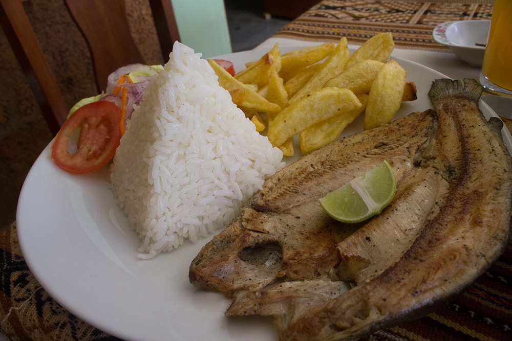 Trucha a la Plancha, or grilled trout, is commonly found in the rural Andean regions. It’s a very simple, but very tasty meal where the fish is fileted and grilled with lime sprinkled on top. Some rice, potatoes and a token tomato round out this hearty meal.