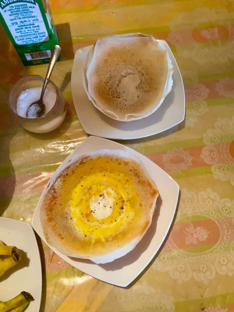 Egg Hoppers, String Hoppers or Coconut Honey Hoppers – this Sri Lankan breakfast dish is a palatable fermented delicacy. Rice flour, coconut milk, and yeast are mixed just to leave the batter on their own for one hour. The puffed-bellied batter is then swirled and tossed on the whirling pan, until a crumpet-like pancake-shaped upheld sharp-edged crispness crisps out.